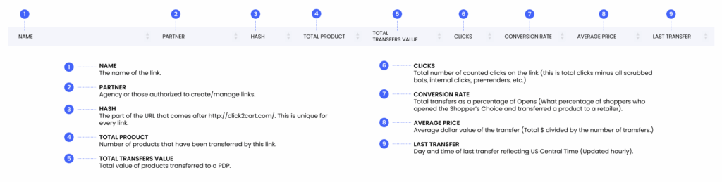 - HASH: The part of the URL that comes after http://click2cart.com/. This is unique for every link.