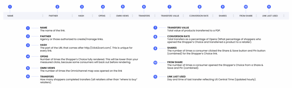 - SHARES: The number of times a consumer clicked the Share & Save button and Pin button (combined) for the Shopper’s Choice link.
